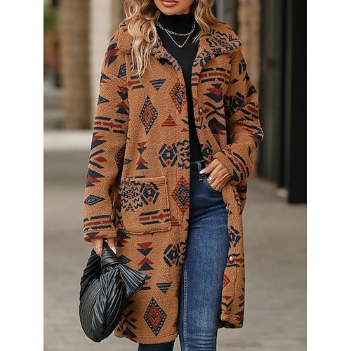Per donna Cappotto Invernale Confortevole Traspirante Tasca Stampato Vintage Pelliccia Casual Geometrico Vacanza Streetwear Abbigliamento quotidiano Uscire Monopetto Regolare Collo ripiegato