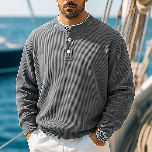 Per uomo Top a Maglia a Coste Testurizzato Streetwear Casuale Bavero Manica Lunga Essenziale Moderno Semplice 2 Pezzi Bottoni Primavera Autunno Tutte le stagioni Vestibilità regolare Grigio / Blu