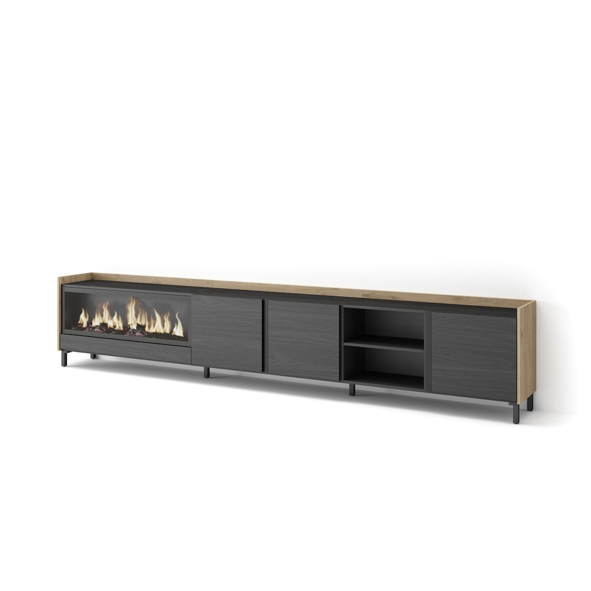 TV-Schrank, Lowboard, 315x61x35 cm, Für TV-Geräte bis zu 80", Elektrokamin XXL, Industriedesign, Schwarz Eiche