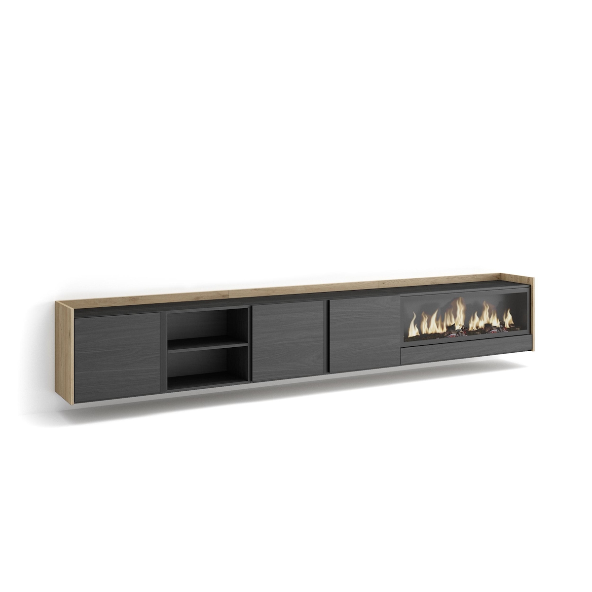 TV-Schrank, Lowboard, 315x50x35 cm, Für TV-Geräte bis zu 80", Elektrokamin XXL, Hängend, Schwarz Eiche