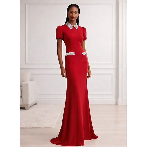 Linea ad A Strascico a Terra Abito da Sera Abito formale Elegante Scintillante Abbellito Manica Corta Girocollo Matrimonio Formale Tasca Crepe Elasticizzato con Cristalli