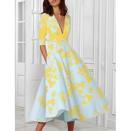 Linea ad A Lunghezza Tè Abiti da Cocktail Elegante Floreale Manica 3/4 Scollo a V Matrimonio Formale Tasca Jacquard con Pieghe