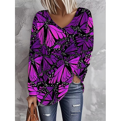 Per donna Maglietta Grafico Farfalla Vintage Elegante Casual Manica Lunga Scollo a V Top Regolari Quotidiano Stampato Blu Viola Arancione Verde Primavera Autunno