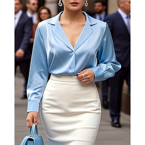 Per donna Camicia Elegant Elegante Raso/Satin Tinta unica Semplice Affari Essenziale Maturo Manica Lunga Colletto a Camicia Top Regolari Lavoro Casuale Quotidiano Bottoni Bianco Giallo Verde chiaro