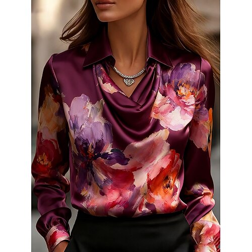 Per donna Camicia Floreale Elegante Casual Manica Lunga Scollo a Cascata Top Regolari Quotidiano Lavoro Ferie Stampato Drappeggiato Rosa Viola Primavera Autunno
