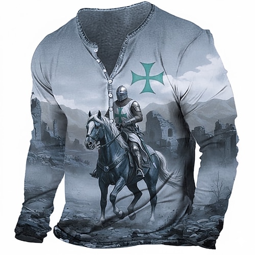 Per uomo Grafico Cavalieri Templari Maglietta Maglia Henley Manica Lunga Vintage Designer Elegante All'aperto Casuale Quotidiano Primavera Primavera Estate Marrone Rosso Blu Henley Maglietta Henley