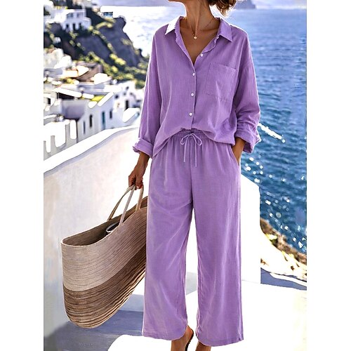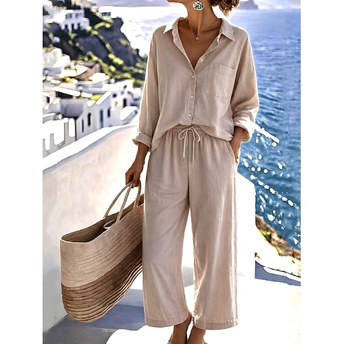 Set di pantaloni in cotone e lino da donna Bolero Top Camicia a maniche lunghe Colletto Colore solido Moda Streetwear Casuale Quotidiano Outdoor Blu Nero Bianco Estate Vestibilità ampia