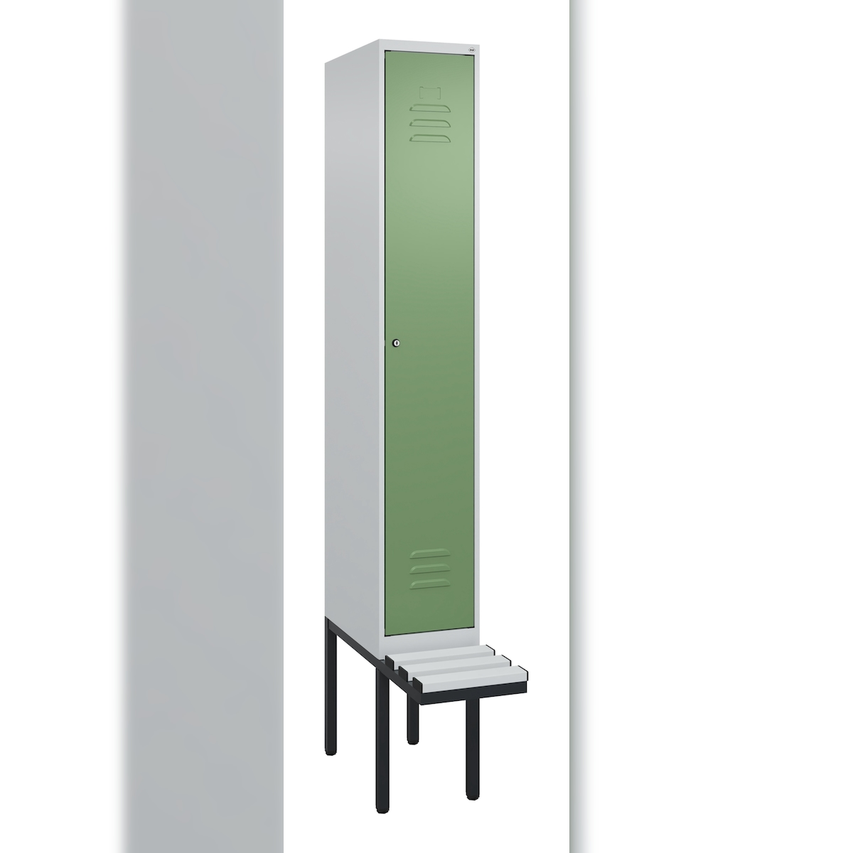 C+P Spind Classic PLUS, Kunststoff schwebende Sitzbank, 1 Abteil, HxBxT 212x30x82cm, Zylinderschloss, Hellgrau/Resedagrün von PROREGAL