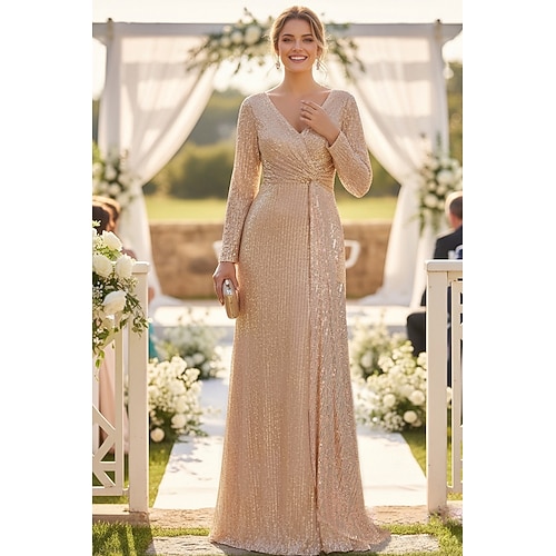 Linea ad A Strascico a Terra Abito da invitata a nozze Abito Formale Abito da sera Abito da cerimonia per signora Manica Lunga Scollo a V Elegante Brillare Splendere Anni 1920 Formale Ospite di