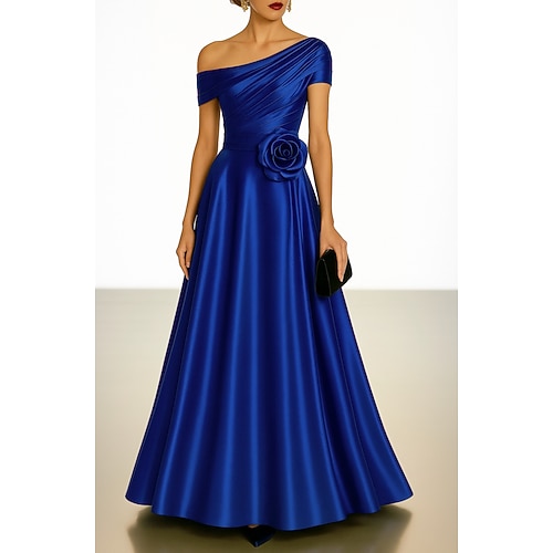 Linea ad A Lunghezza al pavimento Abito da Sera Da principessa Abito formale Elegante Manica Corta Monospalla Matrimonio Formale Raso Elasticizzato con Pieghe