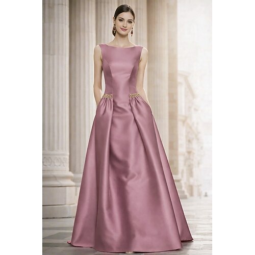Linea ad A Lunghezza al pavimento Abito da Sera Elegante Brillanti Senza Maniche Scollo a Barca Matrimonio Formale Raso con Arricciato Cristalli