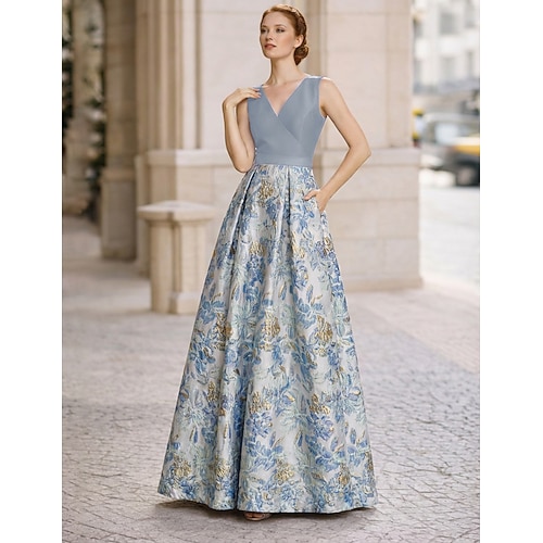 Linea ad A Lunghezza al pavimento Abito da Sera Elegante Senza Maniche Scollo a V Matrimonio Formale Tasca Raso Jacquard con Pieghe