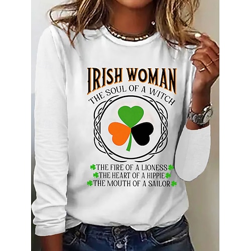 T-shirt da donna per il giorno di San Patrizio Graphic Shamrock Lettera Stilosa Classica Casual a maniche lunghe Collo tondo Tops normali Stampa Daily Blu Nero Bianca Rosa Beige Primavera Autunno