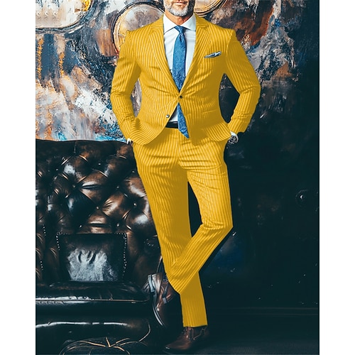 Per uomo Abiti Giacca Attività commerciale Cocktail party Ricevimento di matrimonio Di tendenza Informale Primavera Autunno Poliestere Strisce Bottoni Tasche Comodo Monopetto Giacca Giallo Blu
