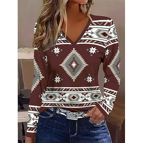 Per donna Maglietta Grafico Geometrico Tribale Vintage Elegante Classico Manica Lunga Scollo a V Top Regolari Quotidiano Stampato Marrone rossastro Primavera Autunno Inverno