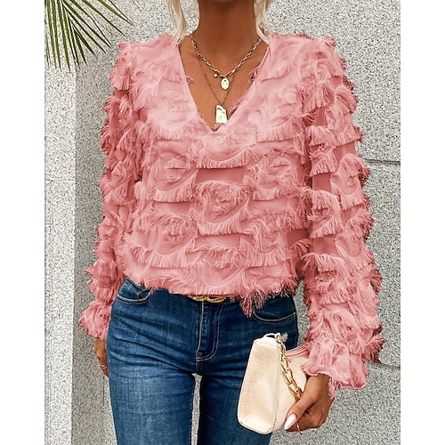 Per donna Camicia Blusa Semplice Elegante Moderno Manica Lunga Scollo a V Top Regolari Quotidiano Ferie Uscire Piuma Nero Bianco Rosa Primavera Autunno