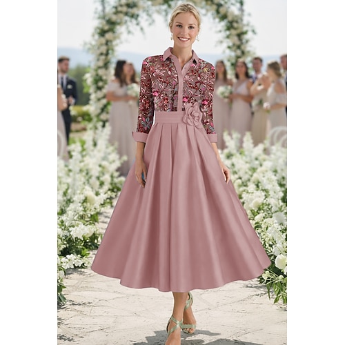 Linea ad A Lunghezza Tè Abito Camicia Abito da sera Abito da cerimonia per signora Manica 3/4 Colletto a Camicia Elegante Vintage Formale Ospite di nozze Derby del Kentucky Raso con Stampa floreale
