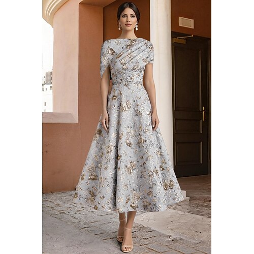 Linea ad A Lunghezza Tè Abito Formale Abiti da Cocktail Elegante Manica Corta Scollo a Barca Matrimonio Formale Tasca Jacquard con Pieghe Arricciato