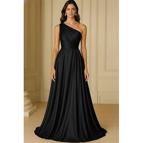 Linea ad A Strascico a Terra Abito da Sera Abito formale Elegante Quotidiano Setoso Senza Maniche Monospalla Matrimonio Formale Raso Jacquard con Arricciato