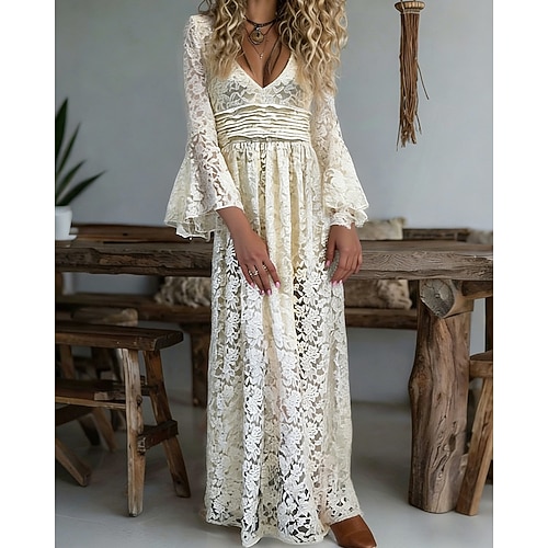 Per donna Abito Lungo Maxi Abito Abito in Pizzo Abito lungo Vestito maxi Abito aderente Elegante Moda Moderno Quotidiano Vacanza Uscire Vestibilità regolare Semplice Manica Lunga Scollo a V Albicocca