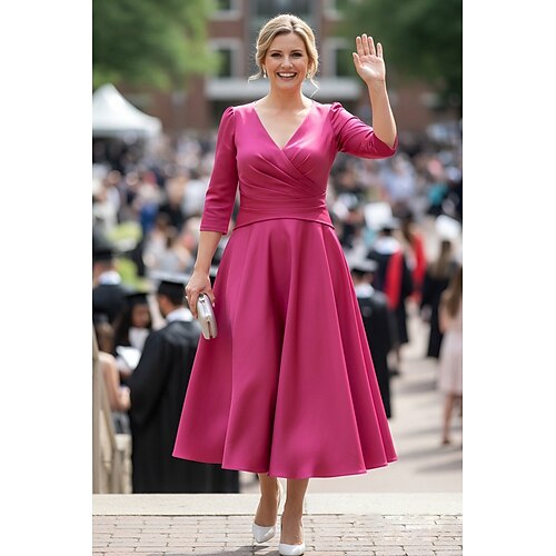 Linea ad A Lunghezza alla caviglia Abito in Raso Abito da Cocktail Abito da cerimonia per signora Manica 3/4 Scollo a V Elegante Vintage Semplice Ospite di nozze Raso con Pieghe Arricciato Tinta unita