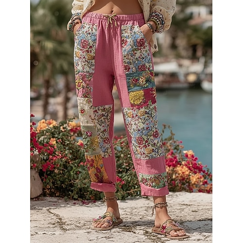 Per donna Finto cotone e lino Pantaloni Casual Quotidiano Lungo Floreale Piuma Tasche Laterali Stampato Traspirabilità Confortevole Inelastico Uscire Weekend Bianco Rosa Beige Primavera Estate