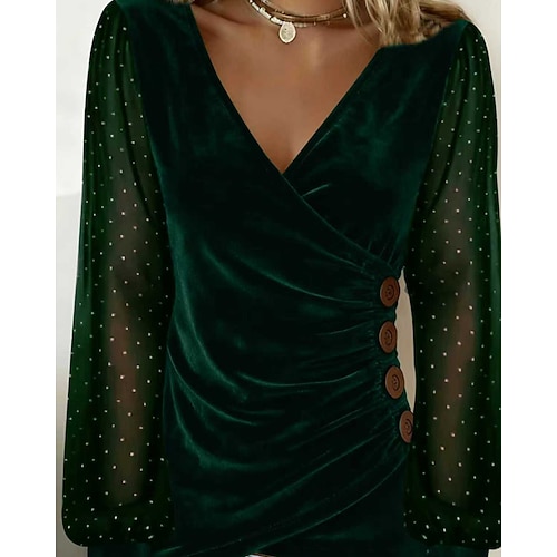 Per donna Velluto Blusa Tinta unica Elegante Manica Lunga Scollo a V Top Regolari Quotidiano Ferie Uscire Arricciato Patchwork Bottoni Nero Vino Verde smeraldo Oro Estate Primavera
