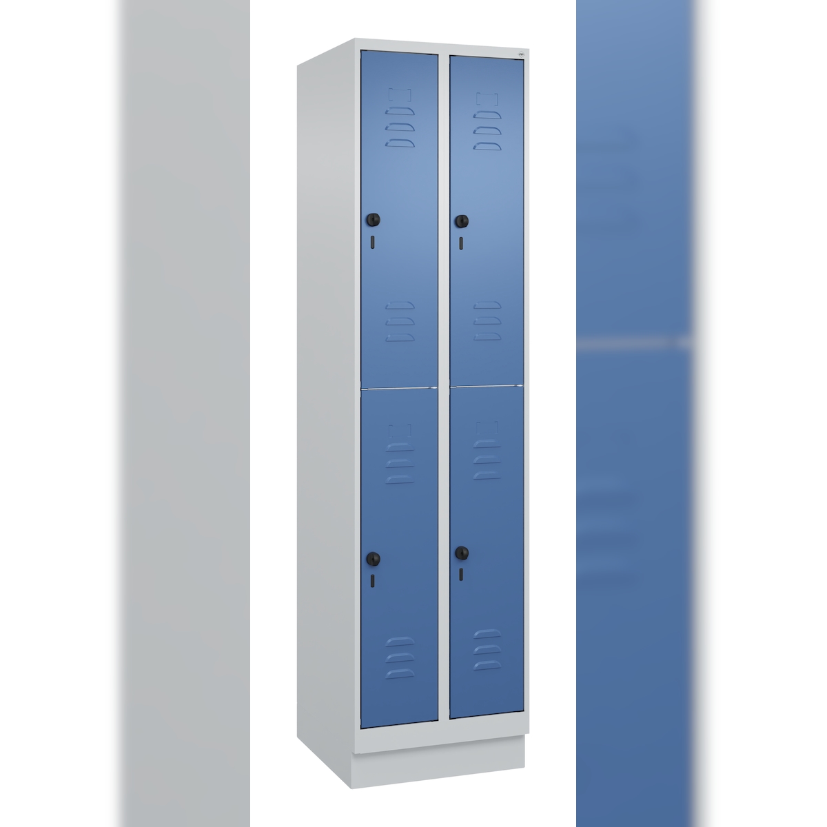 C+P Spind Classic PLUS, Sockel, 4 Abteile, HxBxT 195x50x50cm, Sicherheitsdrehriegel, Hellgrau/Fernblau von PROREGAL