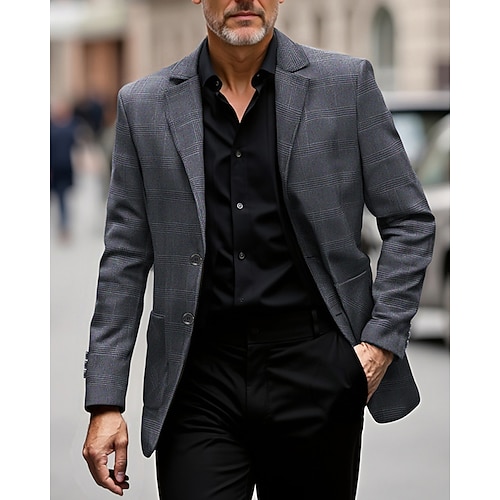 Per uomo Blazer Affari Cocktail party Ricevimento di matrimonio Moda Casual Primavera Autunno Poliestere Plaid Tasca Bottoni Confortevole Monopetto Giacca Marrone Scuro Grigio scuro Grigio chiaro