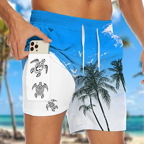 Per uomo Albero di Cocco Piante Tropicali Tartaruga di mare Pantaloncini foderati Pantaloncini da bagno 2 in 1 Pantaloncini da mare Misura del girovita medio Hawaiano Ferie Tasche Laterali Con Fodera