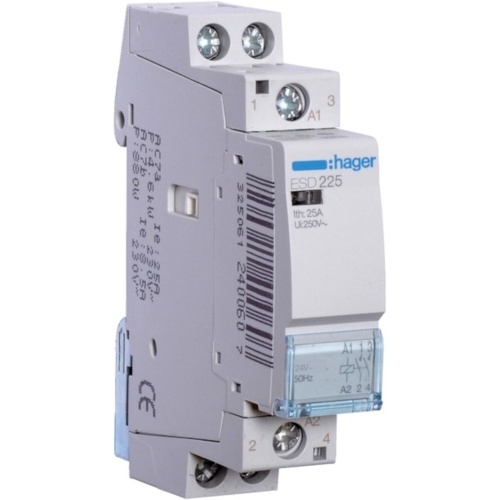 Hager Installationsschütz, 25A, 24V/AC, 230V/AC/DC, 2S, 1900W/AGL, 950VA/LL, 1TE