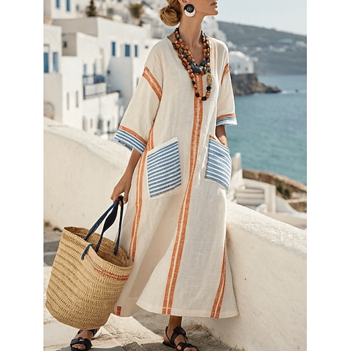 Per donna Abito maxi Abito a trapezio Abito Estivo Casual Quotidiano Vestibilità comoda A righe Manica 3/4 Scollo a V Blu Bianco Rosso Beige Estate Primavera Autunno