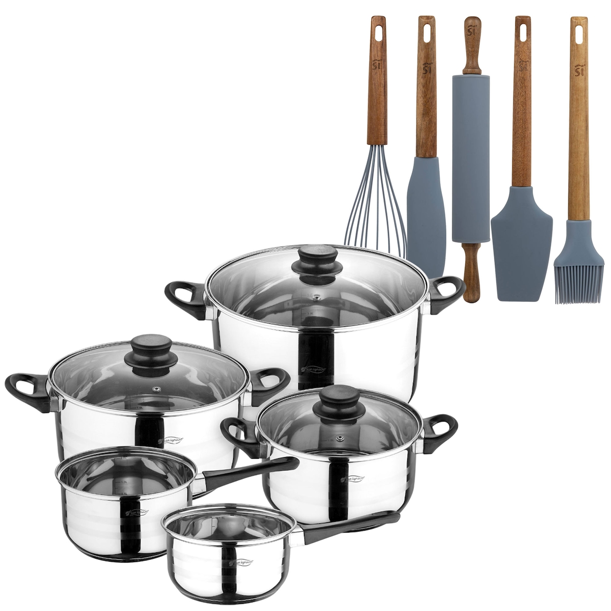 BERGNER - 8-teiliges Edelstahl-Kochgeschirrset (16/18/20/24/28cm), geeignet für Induktionskochfeldermit 5 Küchenutensilien aus Silikon und Holz