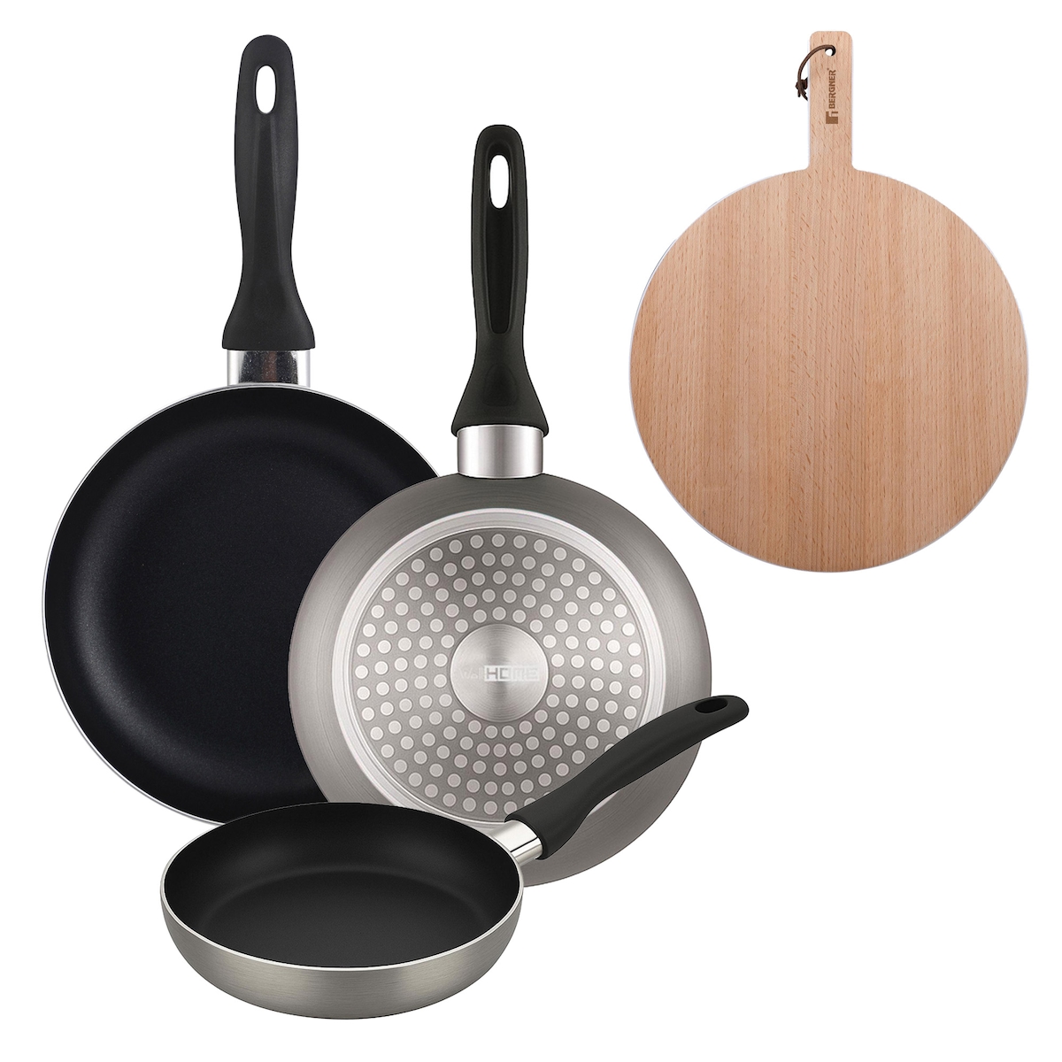 BERGNER - Set aus 3 Pfannen Ø16/20/24cm aus gepresstem Aluminium in metallic-grau mit Rundes Schneidebrett 38x28x1,5 cm aus Buchenholz