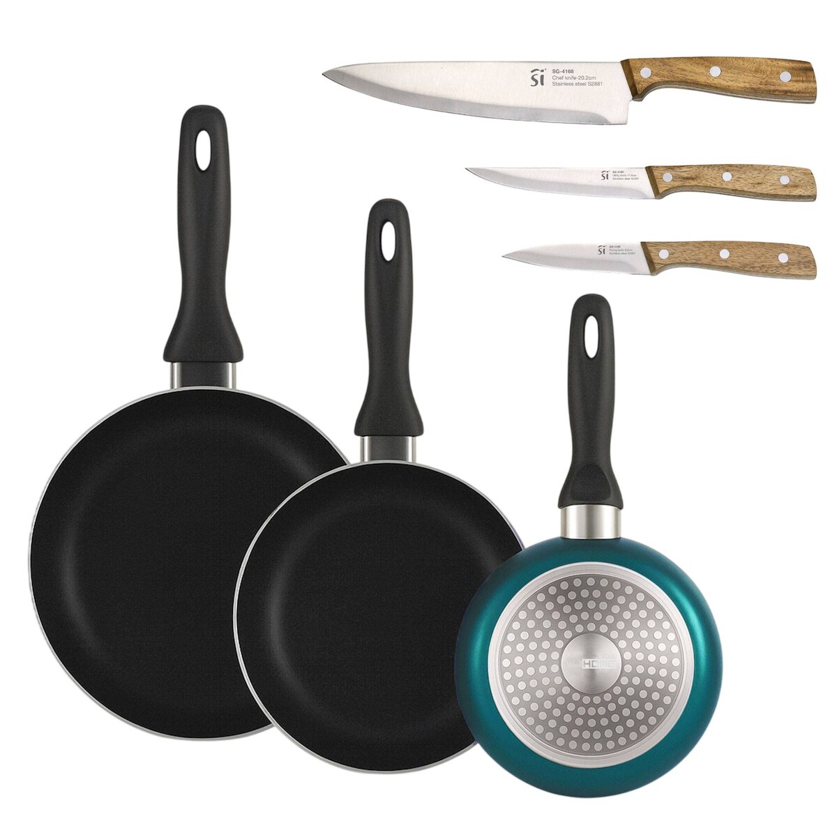 BERGNER - Set aus 3 Pfannen Ø16/20/24cm aus gepresstem Aluminium in metallic-blau mit Set 3 Edelstahlmesser