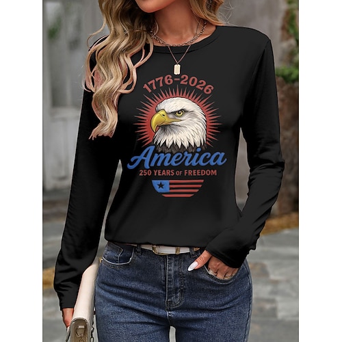 T-Shirt per la Festa dell'Indipendenza Americana 250° per Donne Grafica Bandiera USA Moda Stilosa Classica Manica Lunga Girocollo Collo Rotondo Top Regolari Stampa Giornaliera Weekend Blu Nera Bianca