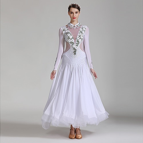 Abito da ballo da sala da donna elegante, bianco, con applicazioni floreali 3D, strass, intaglio, per valzer, tango, rumba moderna, da competizione