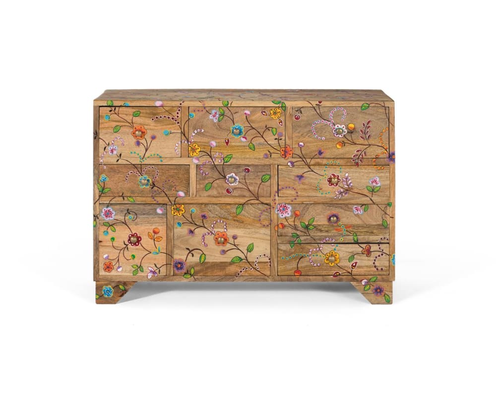 Cassettiera con 10 cassetti intagliata a mano in legno di mango
