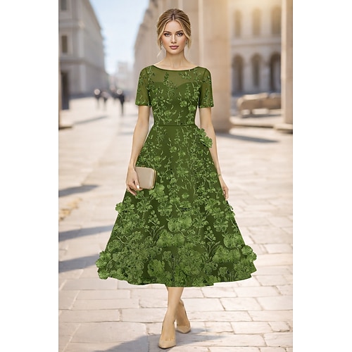 Linea ad A Lunghezza alla caviglia Lunghezza Tè Abiti da Cocktail Elegante Floreale Manica Corta Scollo a Barca Matrimonio Formale Pizzo con Ricamo Applicazioni