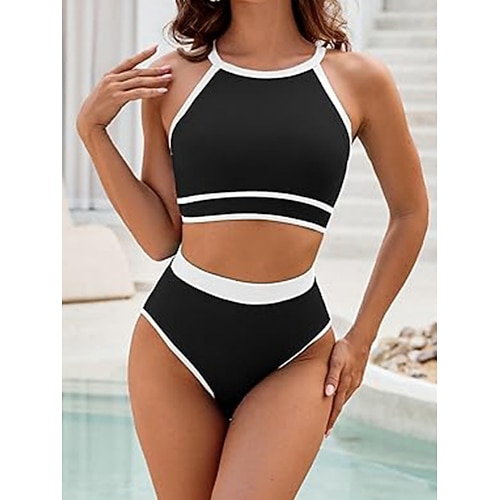 Costume da bagno bikini da donna a 2 pezzi colorblock slip schiena scoperta per vacanze in spiaggia a righe colletto all'americana senza maniche