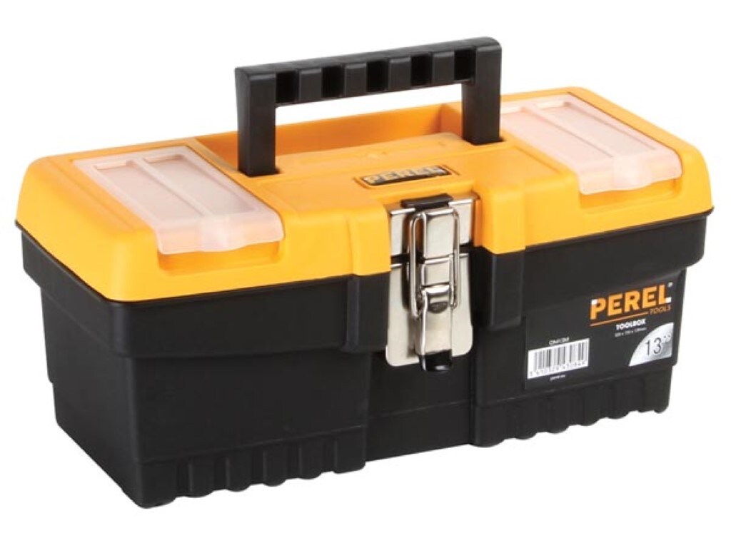Perel Werkzeugkasten, Polypropylen, herausnehmbarer Träger, 2 Organizer im Deckel, Tragegriff, Metallverschluss, Schwarz/Gelb, 320 x 155 x 139 mm.