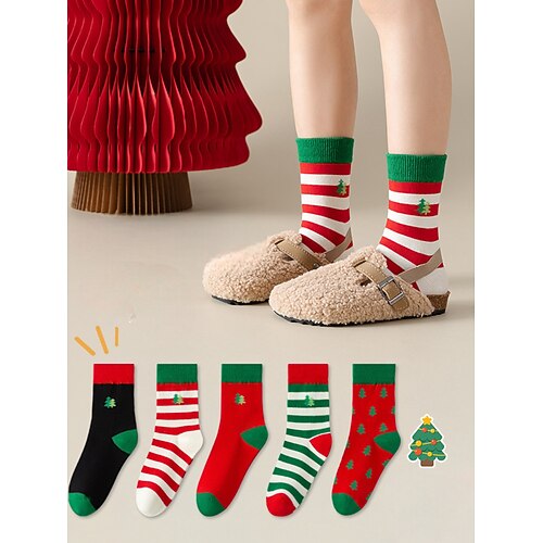 set di calzini natalizi da donna, 5 paia con albero di Natale e motivi a righe, rosso, verde bianco, perfetto per i regali di Natale