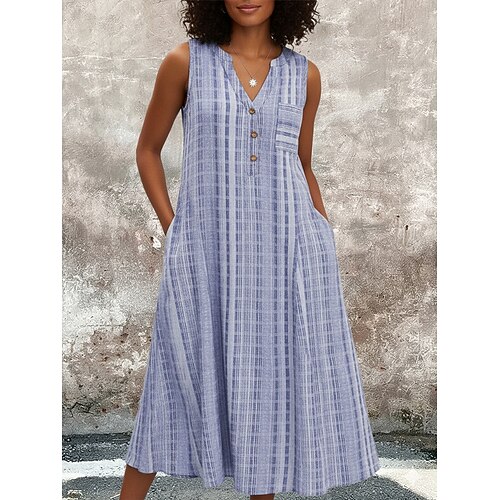 Per donna Abito Midi Abito in cotone e lino Moderno Quotidiano Vacanza Uscire Vestibilità comoda A righe Senza Maniche Scollo a V Blu Nero Rosa Viola Estate Primavera