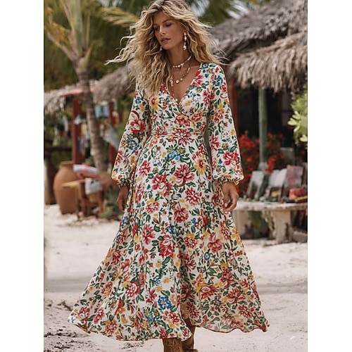 Per donna Abito Midi Abito a trapezio Vacanza Casual Quotidiano Vestibilità comoda Floreale Grafico Manica Lunga Scollo a V Blu Rosa Verde Estate Primavera