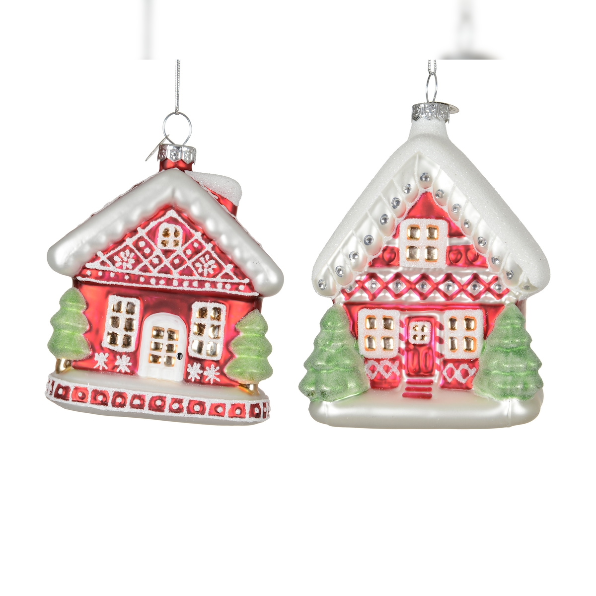 1 Christbaumschmuck Glas 9,2cm Winterhaus Figur zum Aufhängen - Weihnachtsbaum Anhänger Weihnachten Weihnachtsbaumschmuck mundgeblasen Haus Rot Weiß