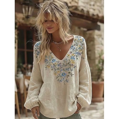 Per donna Camicia Floreale Grafico Elegante Bohemien Vintage Manica Lunga Scollo a V Top Regolari Quotidiano Ferie Arricciato Patchwork Ricamato Blu Rosa Viola chiaro Fucsia Estate Primavera