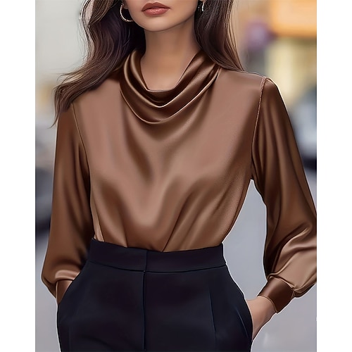 Per donna Camicia Elegant Raso/Satin Blusa Tinta unica Semplice Elegante Vintage Signore Manica Lunga Scollo a Cascata Top Regolari Quotidiano Lavoro Ferie Arricciato Patchwork Drappeggiato Marrone