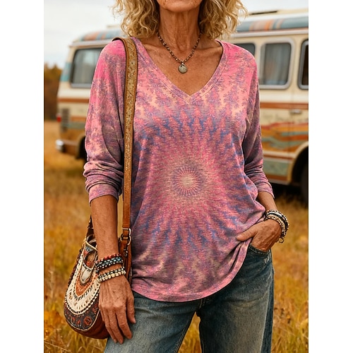 Per donna Maglietta Grafico Geometrico Vintage Moda Elegante Manica Lunga Girocollo Top Regolari Quotidiano Weekend Stampato Blu Rosso Arancione Estate Primavera Autunno