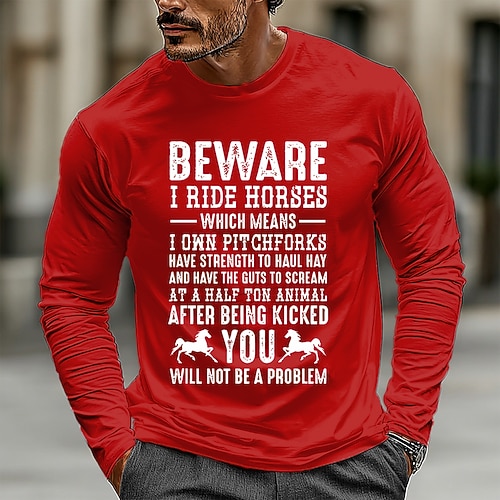 Maglietta divertente da uomo per equitazione, attenzione, vado a cavallo, possiedo forconi, citazione, magliette grafiche a manica lunga, novità, regalo per lui, abbigliamento, abbigliamento da