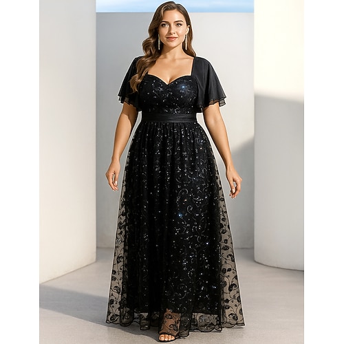 Abito da ospite per matrimoni A-Line fino al pavimento Abiti formali Abito da sera Abito per la madre della sposa maniche corte scollo quadrato elegante vintage taglie forti spandex con paillettes